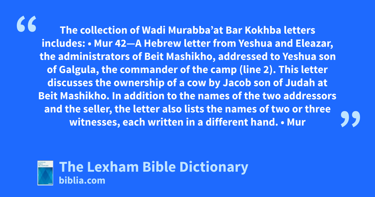 • Mur 42—A Hebrew letter from Yeshua and Eleazar, the administrators of Beit Mashikho, addressed to Yeshua son of Galgula, the commander of the camp (line 2). This letter discusses the ownership of a cow by Jacob son of Judah at Beit Mashikho. In addition to the names of the two addressors and the seller, the letter also lists the names of two or three witnesses, each written in a different hand.