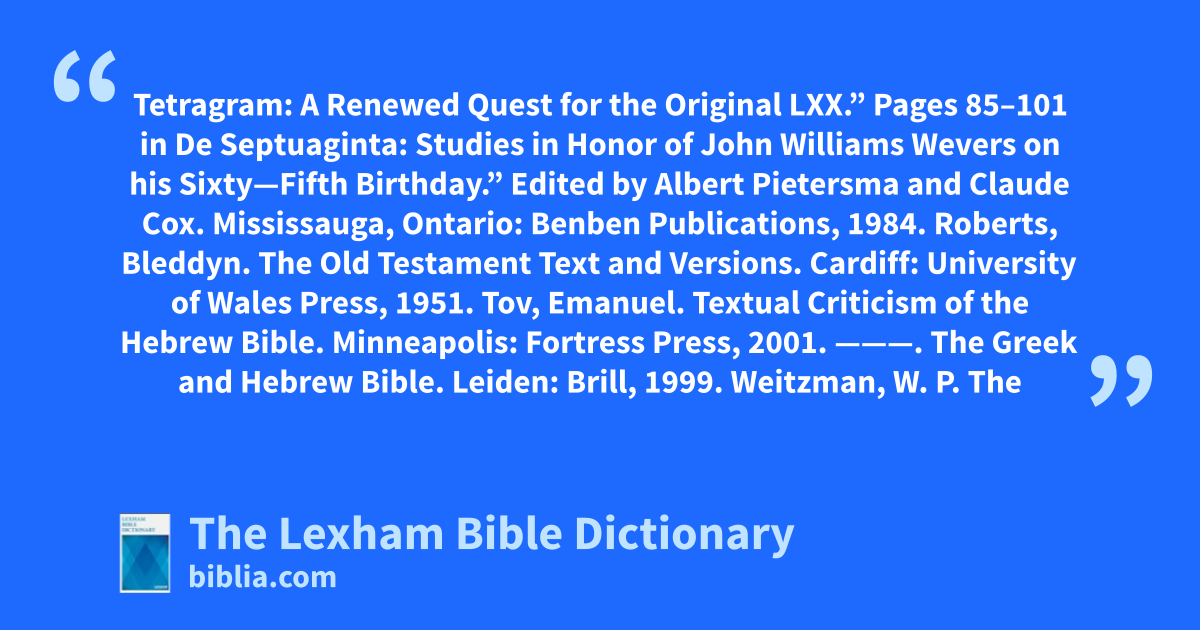 Pietersma, Albert. “Kyrios or Tetragram: A Renewed Quest for the Original LXX.” Pages 85–101 in De Septuaginta: Studies in Honor of John Williams Wevers on his Sixty—Fifth Birthday.” Edited by Albert Pietersma and Claude Cox. Mississauga, Ontario: Benben Publications, 1984.