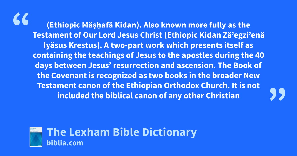Book of the Covenant, Ethiopian (Ethiopic Mäṣḥafä Kidan). Also known more fully as the Testament of Our Lord Jesus Christ (Ethiopic Kidan Zä’egzi’enä Iyäsus Krestus). A two-part work which presents itself as containing the teachings of Jesus to the apostles during the 40 days between Jesus’ resurrection and ascension.