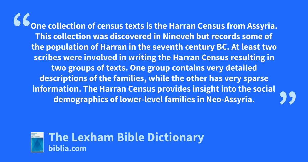 Harran Census. One collection of census texts is the Harran Census from Assyria. This collection was discovered in Nineveh but records some of the population of Harran in the seventh century bc. At least two scribes were involved in writing the Harran Census resulting in two groups of texts. One group contains very detailed descriptions of the families, while the other has very sparse information.