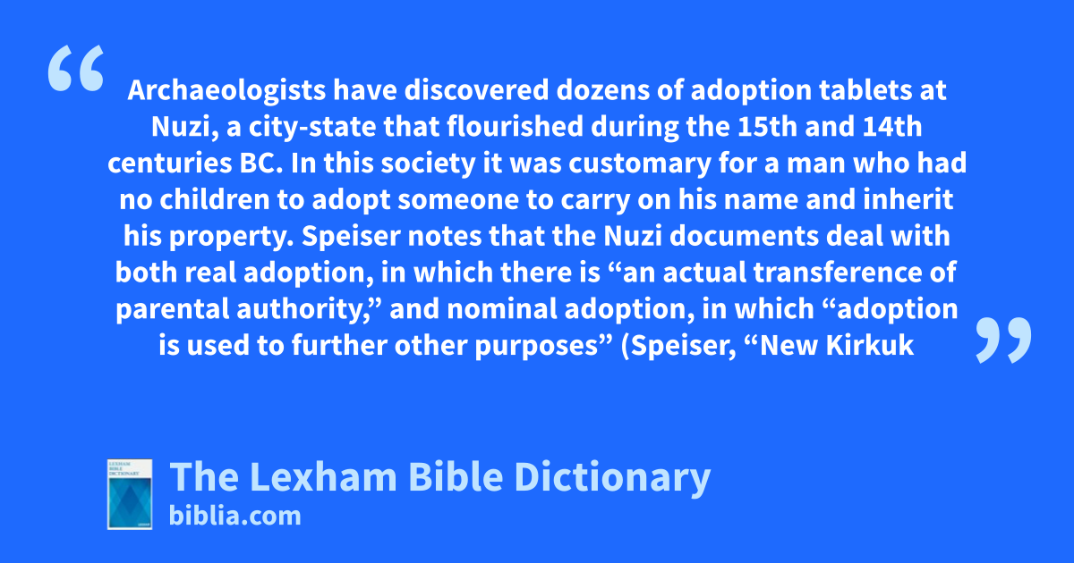 Archaeologists have discovered dozens of adoption tablets at Nuzi, a city-state that flourished during the 15th and 14th centuries bc. In this society it was customary for a man who had no children to adopt someone to carry on his name and inherit his property. Speiser notes that the Nuzi documents deal with both real adoption, in which there is “an actual transference of parental authority,” and nominal adoption, in which “adoption is used to further other purposes” (Speiser, “New Kirkuk Documents,” 7). Adoption was performed for various reasons in addition to childlessness. The adoptee, the majority of whom were males (Frymer-Kensky, “Patriarchal Family Relationships,” 211), did not need to be an orphan or a child; often he was a member of the adopter’s family (such as a nephew or cousin) or a member of the household. Through adoption, this individual would become son and heir in return for taking care of his adopted parents in their old age and providing for them in their death (Frymer-Kensky, “Patriarchal Family Relationships,” 211; Gadd, “Tablets from Kirkuk,” 126–27). This requirement explains why the adopter was sometimes willing to pay the parents for the privilege of adopting a child (Driver and Miles, Babylonian Laws, 385).