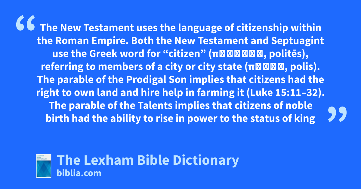 The New Testament uses the language of citizenship within the Roman Empire. Both the New Testament and Septuagint use the Greek word for “citizen” (πολίτης, politēs), referring to members of a city or city state (πόλις, polis). The parable of the Prodigal Son implies that citizens had the right to own land and hire help in farming it (Luke 15:11–32). The parable of the Talents implies that citizens of noble birth had the ability to rise in power to the status of king or ethnarch. This ruler had the power to execute subjects who revolted against him, even if they were citizens (Luke 19:12–27). In Acts, Paul replies to a military commander who purchased his citizenship by stating that he, Paul, was a Roman citizen by birth (Acts 22:28). Paul’s Roman citizenship was linked directly to the city of Tarsus, where he was born (Acts 21:39). The idiom “no ordinary city” (οὐκ ἀσήμου πόλεως, ouk asēmou poleōs), which Paul uses in regard to Tarsus in Acts 21:39, indicates a city’s greatness and as such reflects Paul’s pride in his citizenship (Longenecker, “Acts,” 1043). Hebrews 8:11 references Jer 38:34 LXX (Jer 31:34 MT), which translates the Hebrew word for “friend,” “fellow,” or “neighbor” (רֵעַ, rea') with the Greek word “citizen” (πολίτης, politēs).