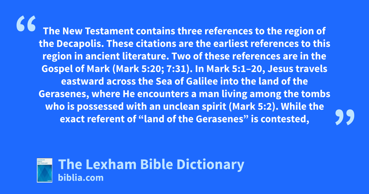 The New Testament contains three references to the region of the Decapolis. These citations are the earliest references to this region in ancient literature. Two of these references are in the Gospel of Mark (Mark 5:20; 7:31). In Mark 5:1–20, Jesus travels eastward across the Sea of Galilee into the land of the Gerasenes, where He encounters a man living among the tombs who is possessed with an unclean spirit (Mark 5:2). While the exact referent of “land of the Gerasenes” is contested, it probably refers to Gerasa, a city associated with the Decapolis. However, various Greek manuscripts identify the city as Gerasa, Gadara, or Gergesa. After exorcising the man of his unclean spirit, Jesus commissions him. Mark 5:20 records that the man goes into the Decapolis proclaiming what Jesus has done for him. The second reference is in Mark 7:31–37, where the author mentions the region in connection with other Gentile locales in which Jesus had been traveling: Tyre and Sidon. While in the Decapolis (Mark 7:31), Jesus encounters and heals a man who is deaf and has a speech impediment.