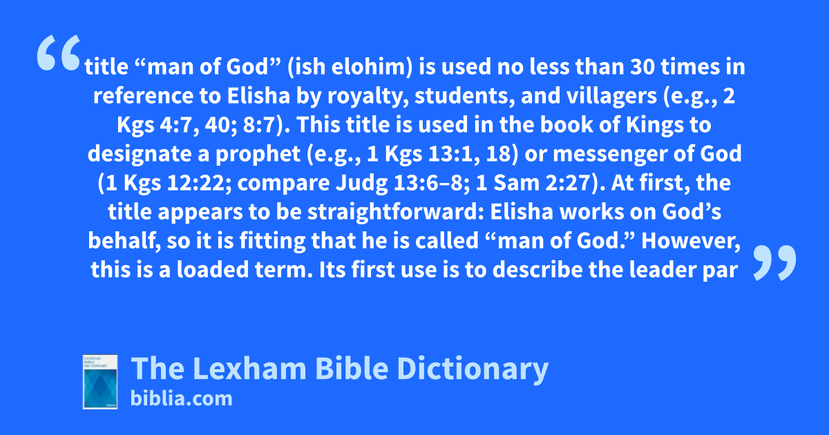 The importance of Elisha in the biblical narrative is signaled by his title “man of God” and by parallels between Elisha and other formative leaders. The title “man of God” (ish elohim) is used no less than 30 times in reference to Elisha by royalty, students, and villagers (e.g., 2 Kgs 4:7, 40; 8:7). This title is used in the book of Kings to designate a prophet (e.g., 1 Kgs 13:1, 18) or messenger of God (1 Kgs 12:22; compare Judg 13:6–8; 1 Sam 2:27). At first, the title appears to be straightforward: Elisha works on God’s behalf, so it is fitting that he is called “man of God.” However, this is a loaded term. Its first use is to describe the leader par excellence—Moses. Even then, Moses is not known as such during his life, but only in memories of him (Deut 33:1; Josh 14:6). Elijah, Elisha’s mentor, also is known as a “man of God” (2 Kgs 1:9–13), although he is not referred to as such nearly as often as Elisha. This title places the prophet Elisha in a particular line of tradition, from Moses to all of the unnamed men of God found throughout Judges, Samuel, and Kings to his predecessor, Elijah. Combined with the tradition that Elisha carries double the spirit of Elijah, the book of Kings argues for a high level of authority and functionality on the part of Elisha. If any man is worthy of being sought by kings (2 Kgs 3:10–12), it is this “man of God.”