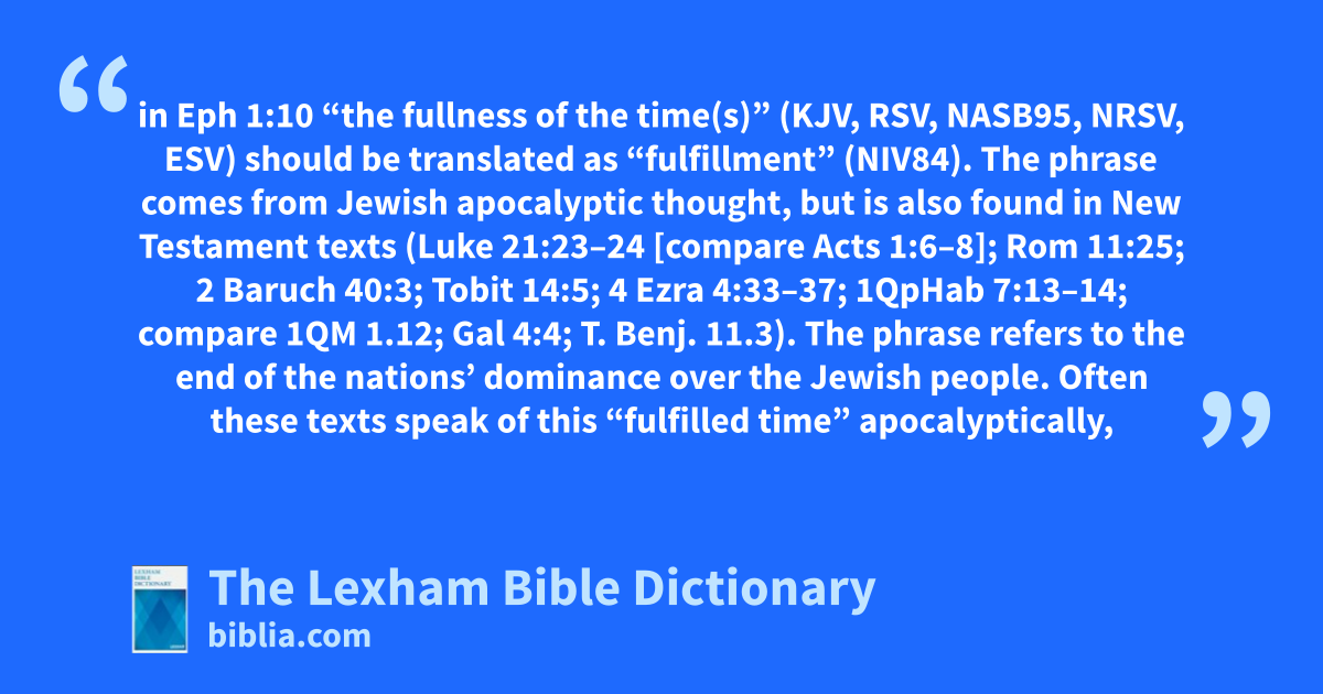 The inscriptions to the emperors Augustus and Nero also shed light on the “fullness” language in Ephesians. First, in Eph 1:10 “the fullness of the time(s)” (KJV, RSV, NASB95, NRSV, ESV) should be translated as “fulfillment” (NIV84). The phrase comes from Jewish apocalyptic thought, but is also found in New Testament texts (Luke 21:23–24 [compare Acts 1:6–8]; Rom 11:25; 2 Baruch 40:3; Tobit 14:5; 4 Ezra 4:33–37; 1QpHab 7:13–14; compare 1QM 1.12; Gal 4:4; T. Benj. 11.3). The phrase refers to the end of the nations’ dominance over the Jewish people. Often these texts speak of this “fulfilled time” apocalyptically, in an attempt to explain the need to await the justice of God for deliverance. Paul now affirmed that God has placed the crucified, risen, and ascended Messiah in charge of the ongoing fulfillment of the times—the Gentiles are brought into God’s people, the church, comprising both Jew and Gentile (Eph 2:14–18). This church-body is the “fulfillment of the One who fulfills all things/events” (Eph 1:23; 4:10; compare Eph 1:10). Part of this fulfillment lies in making the unified Jew-Gentile body into a holy temple (Eph 2:19–21). This language climaxes in Eph 3:15–19—the believer is empowered by the Holy Spirit, indwelt by Christ, knows Christ’s sacrificial love, and is filled with God. In Ephesians 5:18, believers are exhorted to be filled with the Holy Spirit. The last two references may be the only times where “fullness” is the right translation, expressing the idea that the believer is the residence of God’s presence—a temple (compare Eph 2:19–21). Ephesians 4:13 also describes the church body as growing up “into the measure of the stature of the fulfillment of Christ.” The fulfillment here refers to Christ’s life as exemplary person, the Perfect Man. Jesus fulfills humanity, and we are radically called to follow his example of that fulfillment (see esp. Eph 4:20–24, 4:31–5:2; compare 1 Cor 11:1).