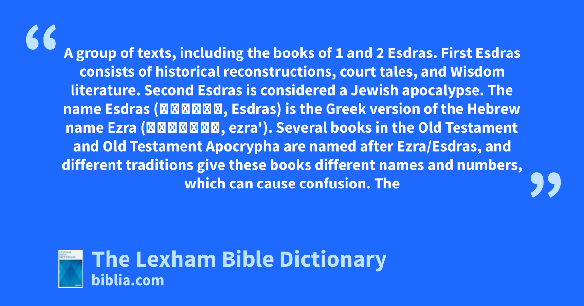 There are also several nonbiblical texts named after Ezra, but these are not grouped with the works usually known as the “books of Esdras.”