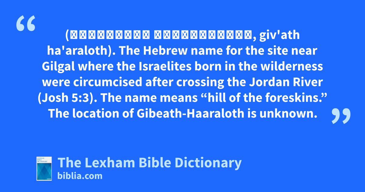 Gibeath-Haaraloth (גִּבְעַ֖ת הָעֲרָלֽוֹת, giv'ath ha'araloth). The Hebrew name for the site near Gilgal where the Israelites born in the wilderness were circumcised after crossing the Jordan River (Josh 5:3). The name means “hill of the foreskins.” The location of Gibeath-Haaraloth is unknown.