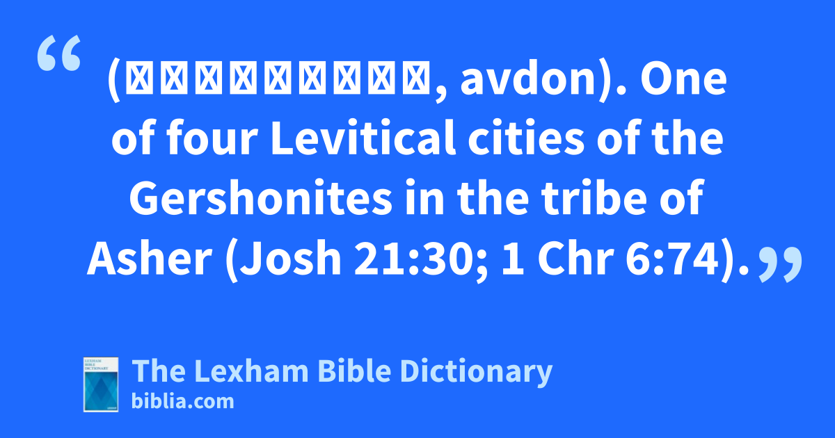 Abdon (עַבְדּוֹן, avdon). One of four Levitical cities of the Gershonites in the tribe of Asher (Josh 21:30; 1 Chr 6:74).