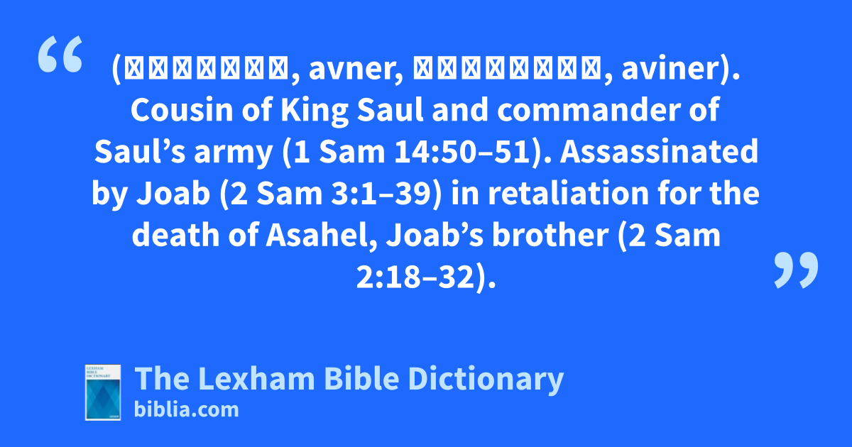 Abner, Son of Ner (אַבְנֵר, avner, אֲבִינֵר, aviner). Cousin of King Saul and commander of Saul’s army (1 Sam 14:50–51). Assassinated by Joab (2 Sam 3:1–39) in retaliation for the death of Asahel, Joab’s brother (2 Sam 2:18–32).