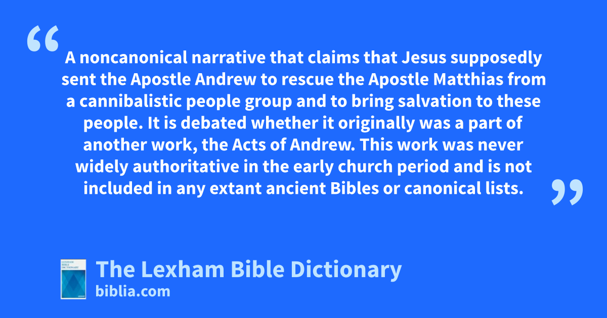 Acts of Andrew and Matthias A noncanonical narrative that claims that Jesus supposedly sent the Apostle Andrew to rescue the Apostle Matthias from a cannibalistic people group and to bring salvation to these people. It is debated whether it originally was a part of another work, the Acts of Andrew. This work was never widely authoritative in the early church period and is not included in any extant ancient Bibles or canonical lists.