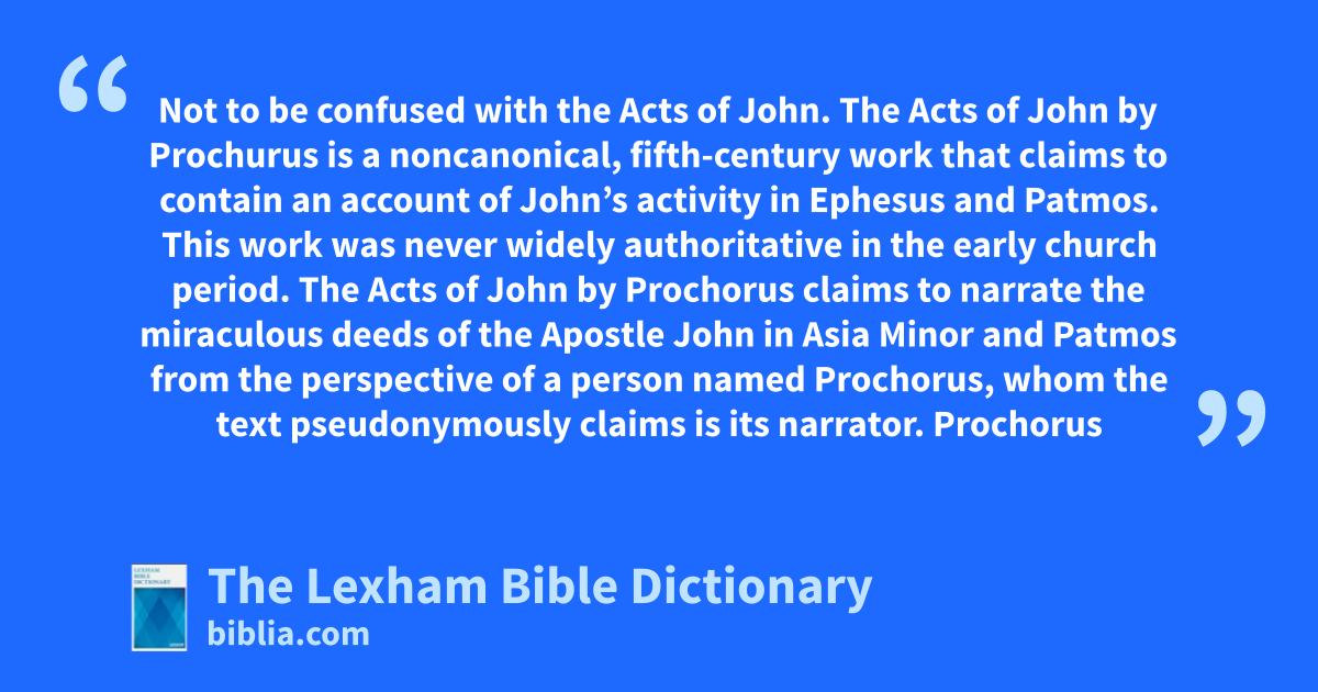 Acts of John by Prochorus Not to be confused with the Acts of John. The Acts of John by Prochurus is a noncanonical, fifth-century work that claims to contain an account of John’s activity in Ephesus and Patmos. This work was never widely authoritative in the early church period.