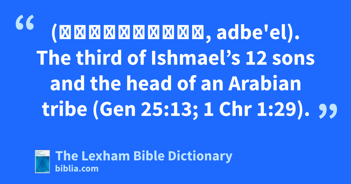 Adbeel, Son of Ishmael (אַדְבְּאֵל, adbe'el). The third of Ishmael’s 12 sons and the head of an Arabian tribe (Gen 25:13; 1 Chr 1:29).