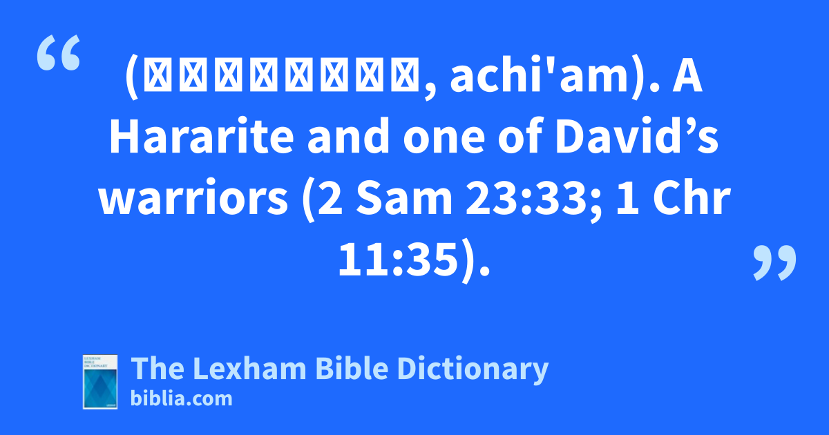 Ahiam, Son of Sharar (אֲחִיאָם, achi'am). A Hararite and one of David’s warriors (2 Sam 23:33; 1 Chr 11:35).