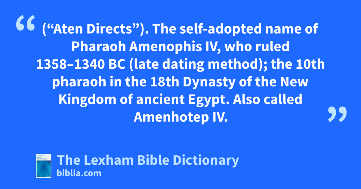 Akhenaten (“Aten Directs”). The self-adopted name of Pharaoh Amenophis IV, who ruled 1358–1340 bc (late dating method); the 10th pharaoh in the 18th Dynasty of the New Kingdom of ancient Egypt. Also called Amenhotep IV.