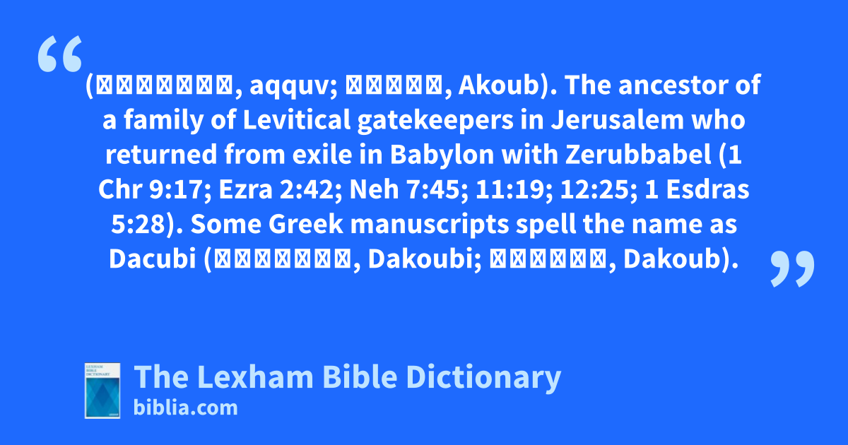 Akkub the Gatekeeper (עַקּוּב, aqquv; Ακουβ, Akoub). The ancestor of a family of Levitical gatekeepers in Jerusalem who returned from exile in Babylon with Zerubbabel (1 Chr 9:17; Ezra 2:42; Neh 7:45; 11:19; 12:25; 1 Esdras 5:28). Some Greek manuscripts spell the name as Dacubi (Δακουβί, Dakoubi; Δακούβ, Dakoub).