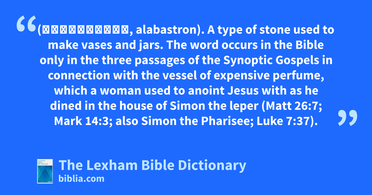 Alabaster (ἀλάβαστρον, alabastron). A type of stone used to make vases and jars. The word occurs in the Bible only in the three passages of the Synoptic Gospels in connection with the vessel of expensive perfume, which a woman used to anoint Jesus with as he dined in the house of Simon the leper (Matt 26:7; Mark 14:3; also Simon the Pharisee; Luke 7:37).