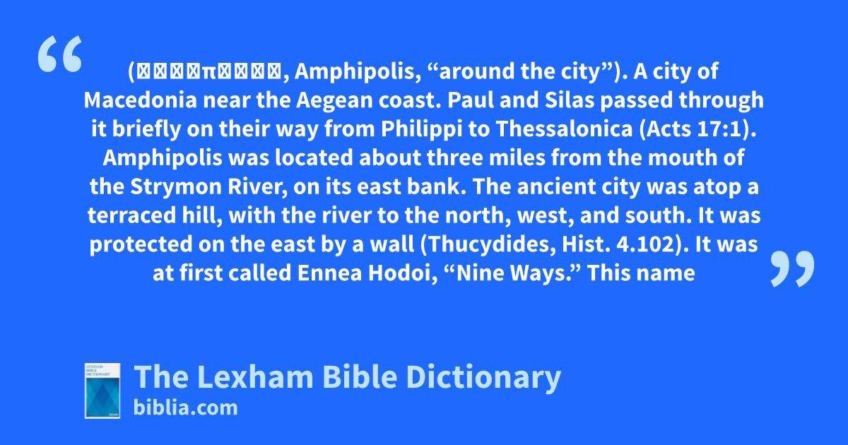 Amphipolis (Ἀμφίπολις, Amphipolis, “around the city”). A city of Macedonia near the Aegean coast. Paul and Silas passed through it briefly on their way from Philippi to Thessalonica (Acts 17:1).