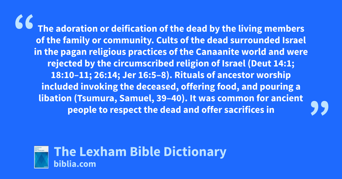 Ancestor Worship The adoration or deification of the dead by the living members of the family or community. Cults of the dead surrounded Israel in the pagan religious practices of the Canaanite world and were rejected by the circumscribed religion of Israel (Deut 14:1; 18:10–11; 26:14; Jer 16:5–8).