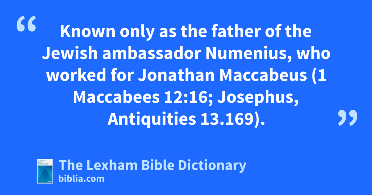 Antiochus, Father of Numenius Known only as the father of the Jewish ambassador Numenius, who worked for Jonathan Maccabeus (1 Maccabees 12:16; Josephus, Antiquities 13.169).