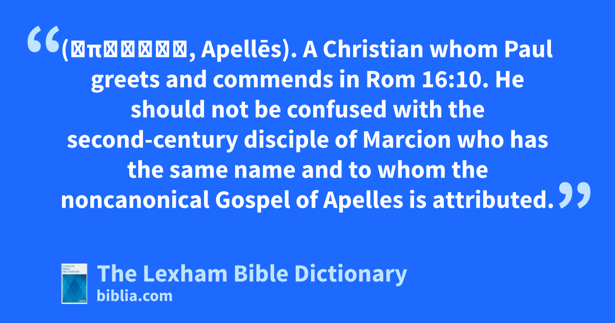 Apelles (Ἀπελλῆς, Apellēs). A Christian whom Paul greets and commends in Rom 16:10. He should not be confused with the second-century disciple of Marcion who has the same name and to whom the noncanonical Gospel of Apelles is attributed.
