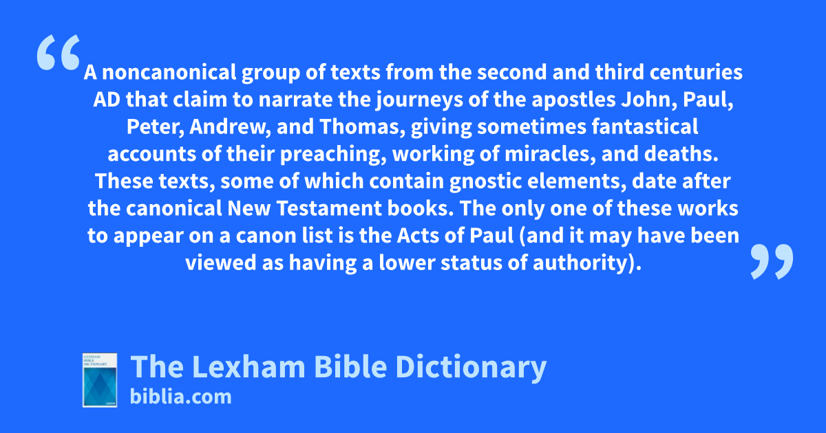 Apocryphal Acts A noncanonical group of texts from the second and third centuries ad that claim to narrate the journeys of the apostles John, Paul, Peter, Andrew, and Thomas, giving sometimes fantastical accounts of their preaching, working of miracles, and deaths. These texts, some of which contain gnostic elements, date after the canonical New Testament books. The only one of these works to appear on a canon list is the Acts of Paul (and it may have been viewed as having a lower status of authority). None of the remaining apocryphal acts were widely authoritative in the early church period and Eusebius, the first of the church fathers to refer to them directly, condemned these works as heretical and indicated that the Acts of Paul was also one of the “spurious works” (Ecclesiastical History 3.25.4–6).