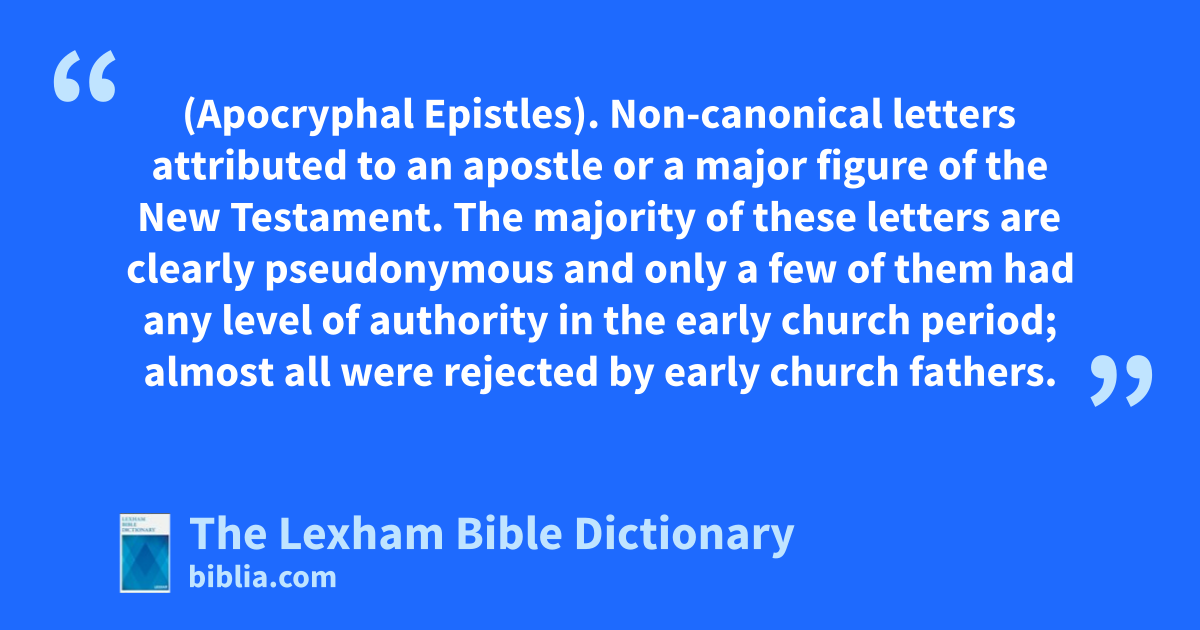 Apocryphal Letters (Apocryphal Epistles). Non-canonical letters attributed to an apostle or a major figure of the New Testament. The majority of these letters are clearly pseudonymous and only a few of them had any level of authority in the early church period; almost all were rejected by early church fathers.