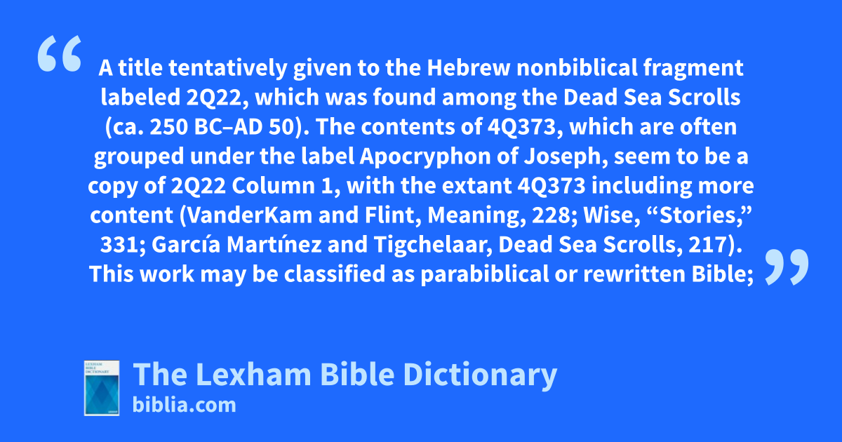 Apocryphon of David A title tentatively given to the Hebrew nonbiblical fragment labeled 2Q22, which was found among the Dead Sea Scrolls (ca. 250 bc–ad 50). The contents of 4Q373, which are often grouped under the label Apocryphon of Joseph, seem to be a copy of 2Q22 Column 1, with the extant 4Q373 including more content (VanderKam and Flint, Meaning, 228; Wise, “Stories,” 331; Garcı́a Martı́nez and Tigchelaar, Dead Sea Scrolls, 217). This work may be classified as parabiblical or rewritten Bible; it may also be classified as previously unknown pseudepigrapha.