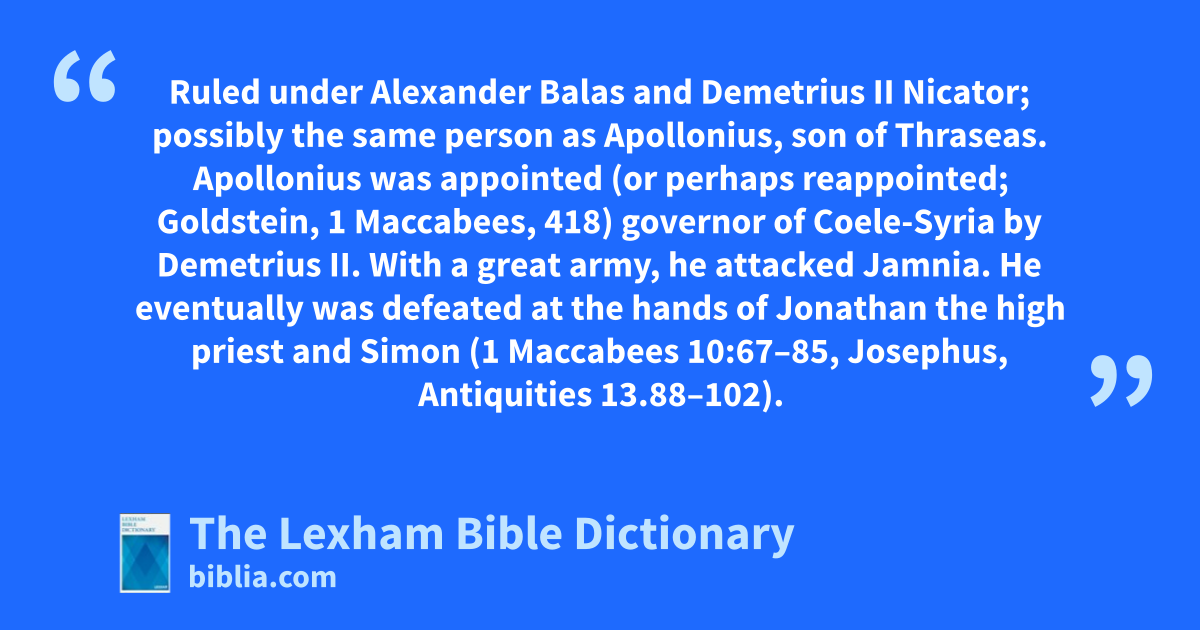 Apollonius, Governor of Coele-Syria and Phoenicia Ruled under Alexander Balas and Demetrius II Nicator; possibly the same person as Apollonius, son of Thraseas. Apollonius was appointed (or perhaps reappointed; Goldstein, 1 Maccabees, 418) governor of Coele-Syria by Demetrius II. With a great army, he attacked Jamnia. He eventually was defeated at the hands of Jonathan the high priest and Simon (1 Maccabees 10:67–85, Josephus, Antiquities 13.88–102).