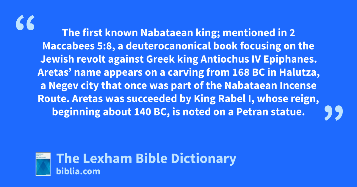 Aretas I The first known Nabataean king; mentioned in 2 Maccabees 5:8, a deuterocanonical book focusing on the Jewish revolt against Greek king Antiochus IV Epiphanes. Aretas’ name appears on a carving from 168 bc in Halutza, a Negev city that once was part of the Nabataean Incense Route. Aretas was succeeded by King Rabel I, whose reign, beginning about 140 bc, is noted on a Petran statue.
