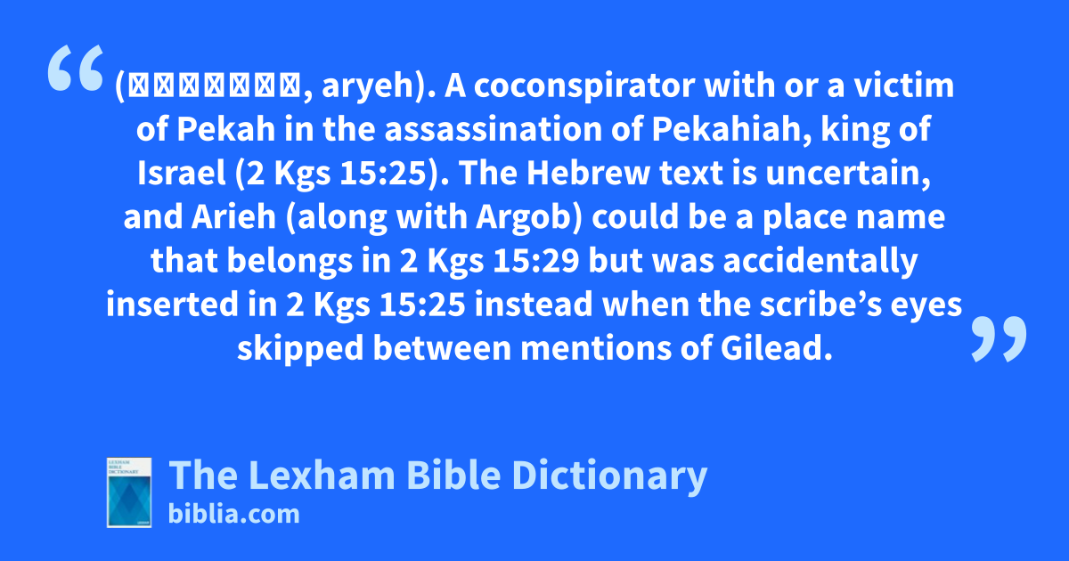 Arieh (אַרְיֵה, aryeh). A coconspirator with or a victim of Pekah in the assassination of Pekahiah, king of Israel (2 Kgs 15:25). The Hebrew text is uncertain, and Arieh (along with Argob) could be a place name that belongs in 2 Kgs 15:29 but was accidentally inserted in 2 Kgs 15:25 instead when the scribe’s eyes skipped between mentions of Gilead.