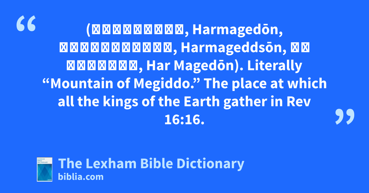 Armageddon (Ἁρμαγεδών, Harmagedōn, Ἁρμαγεδδσών, Harmageddsōn, Ἁρ Μαγεδών, Har Magedōn). Literally “Mountain of Megiddo.” The place at which all the kings of the Earth gather in Rev 16:16.