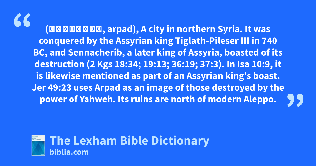 Arpad (אַרְפָּד, arpad), A city in northern Syria. It was conquered by the Assyrian king Tiglath-Pileser III in 740 bc, and Sennacherib, a later king of Assyria, boasted of its destruction (2 Kgs 18:34; 19:13; 36:19; 37:3). In Isa 10:9, it is likewise mentioned as part of an Assyrian king’s boast. Jer 49:23 uses Arpad as an image of those destroyed by the power of Yahweh. Its ruins are north of modern Aleppo.