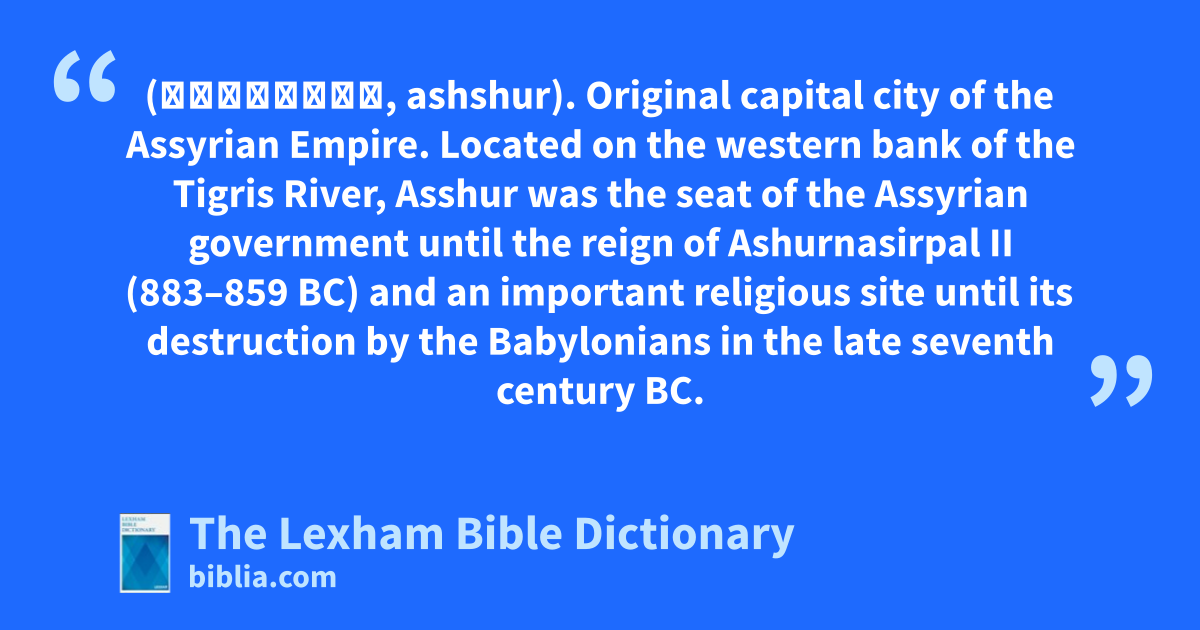 Asshur, Assyrian Capital City (אַשּׁוּר, ashshur). Original capital city of the Assyrian Empire. Located on the western bank of the Tigris River, Asshur was the seat of the Assyrian government until the reign of Ashurnasirpal II (883–859 bc) and an important religious site until its destruction by the Babylonians in the late seventh century bc.