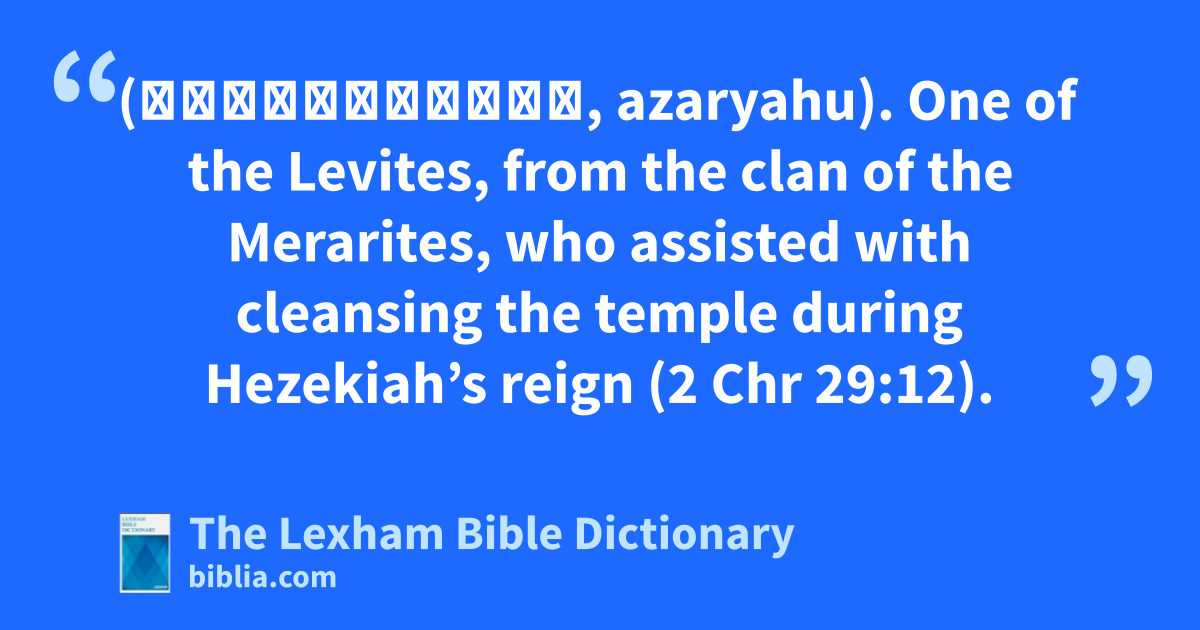 Azariah, Son of Jehallelel (עֲזַרְיָהוּ, azaryahu). One of the Levites, from the clan of the Merarites, who assisted with cleansing the temple during Hezekiah’s reign (2 Chr 29:12).