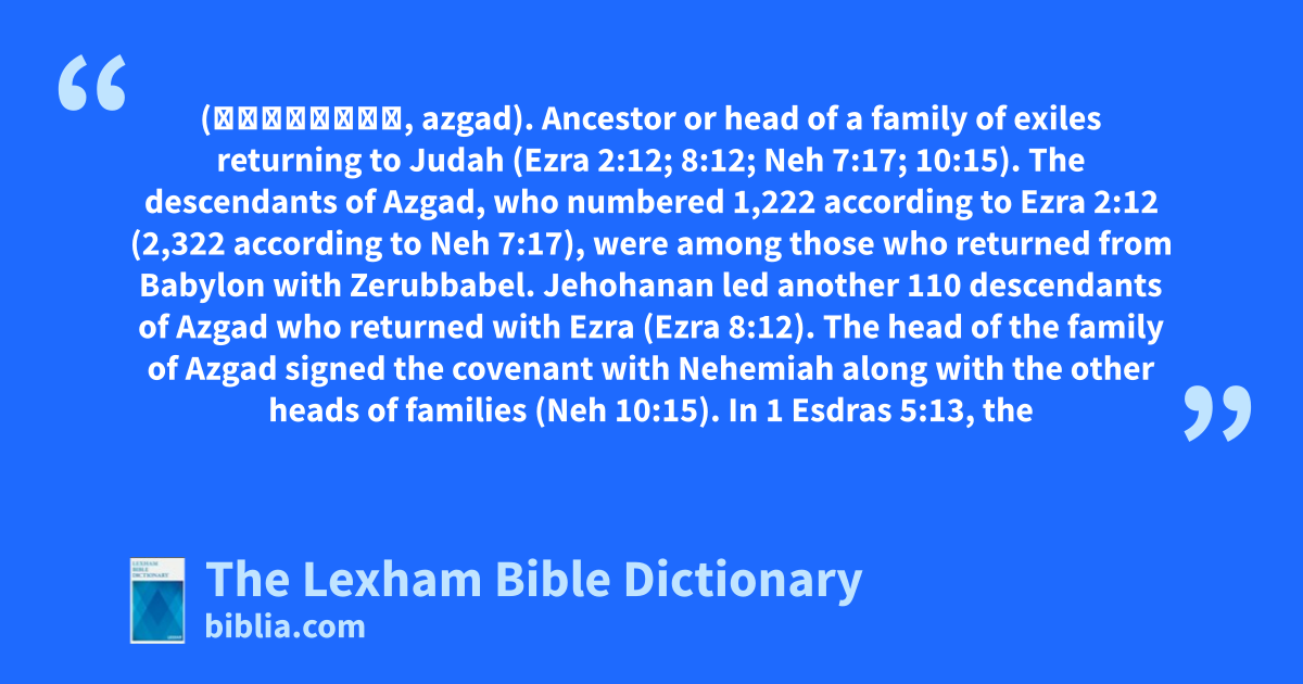 The descendants of Azgad, who numbered 1,222 according to Ezra 2:12 (2,322 according to Neh 7:17), were among those who returned from Babylon with Zerubbabel. Jehohanan led another 110 descendants of Azgad who returned with Ezra (Ezra 8:12). The head of the family of Azgad signed the covenant with Nehemiah along with the other heads of families (Neh 10:15). In 1 Esdras 5:13, the name appears as “Astad.” In 1 Esdras 8:38, it appears as “Astath.”