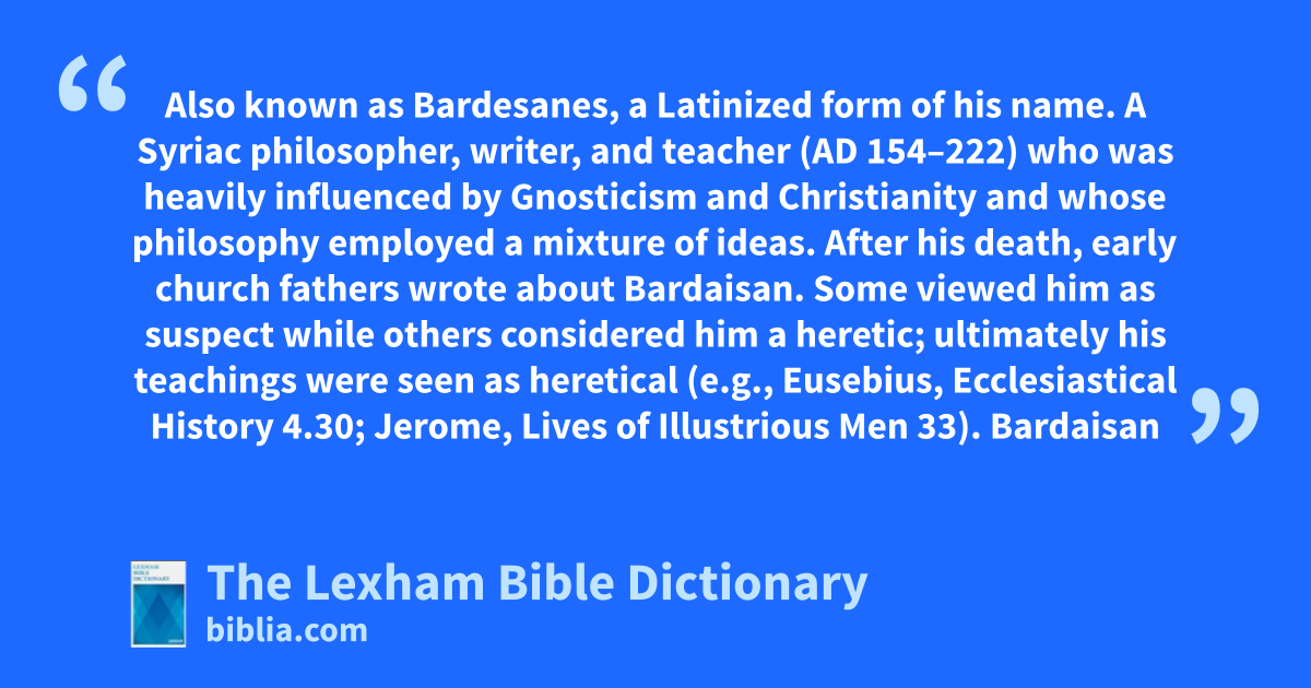 Bardaisan of Edessa Also known as Bardesanes, a Latinized form of his name. A Syriac philosopher, writer, and teacher (ad 154–222) who was heavily influenced by Gnosticism and Christianity and whose philosophy employed a mixture of ideas. After his death, early church fathers wrote about Bardaisan. Some viewed him as suspect while others considered him a heretic; ultimately his teachings were seen as heretical (e.g., Eusebius, Ecclesiastical History 4.30; Jerome, Lives of Illustrious Men 33).