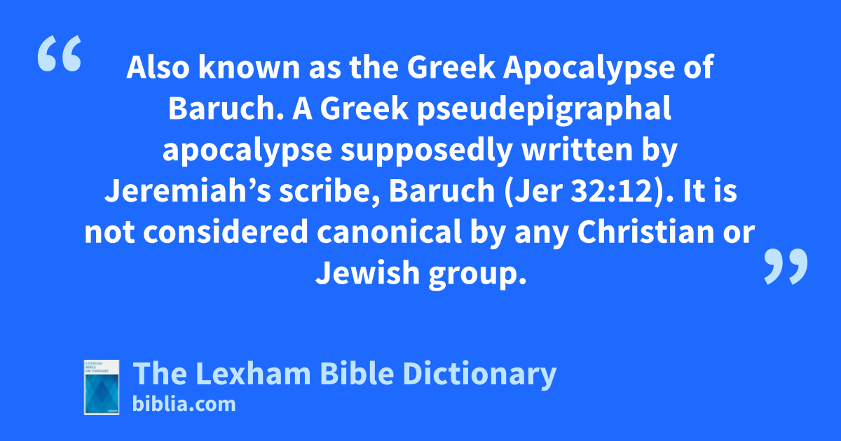Baruch, Third Book Of Also known as the Greek Apocalypse of Baruch. A Greek pseudepigraphal apocalypse supposedly written by Jeremiah’s scribe, Baruch (Jer 32:12). It is not considered canonical by any Christian or Jewish group.