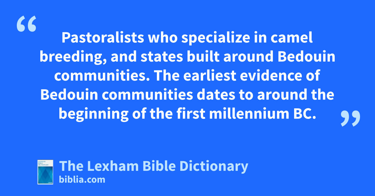 Bedouin and Bedouin States Pastoralists who specialize in camel breeding, and states built around Bedouin communities. The earliest evidence of Bedouin communities dates to around the beginning of the first millennium bc.