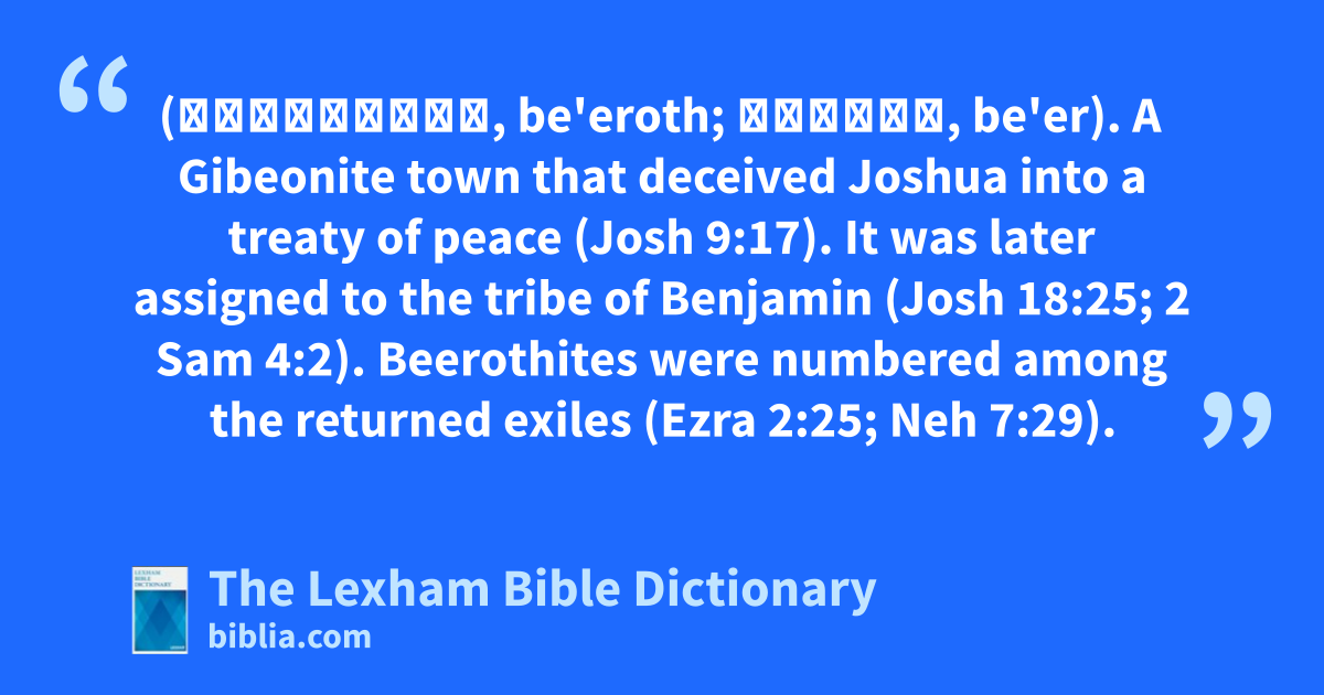 Beeroth (בְּאֵרוֹת, be'eroth; בְּאֵר, be'er). A Gibeonite town that deceived Joshua into a treaty of peace (Josh 9:17). It was later assigned to the tribe of Benjamin (Josh 18:25; 2 Sam 4:2). Beerothites were numbered among the returned exiles (Ezra 2:25; Neh 7:29).