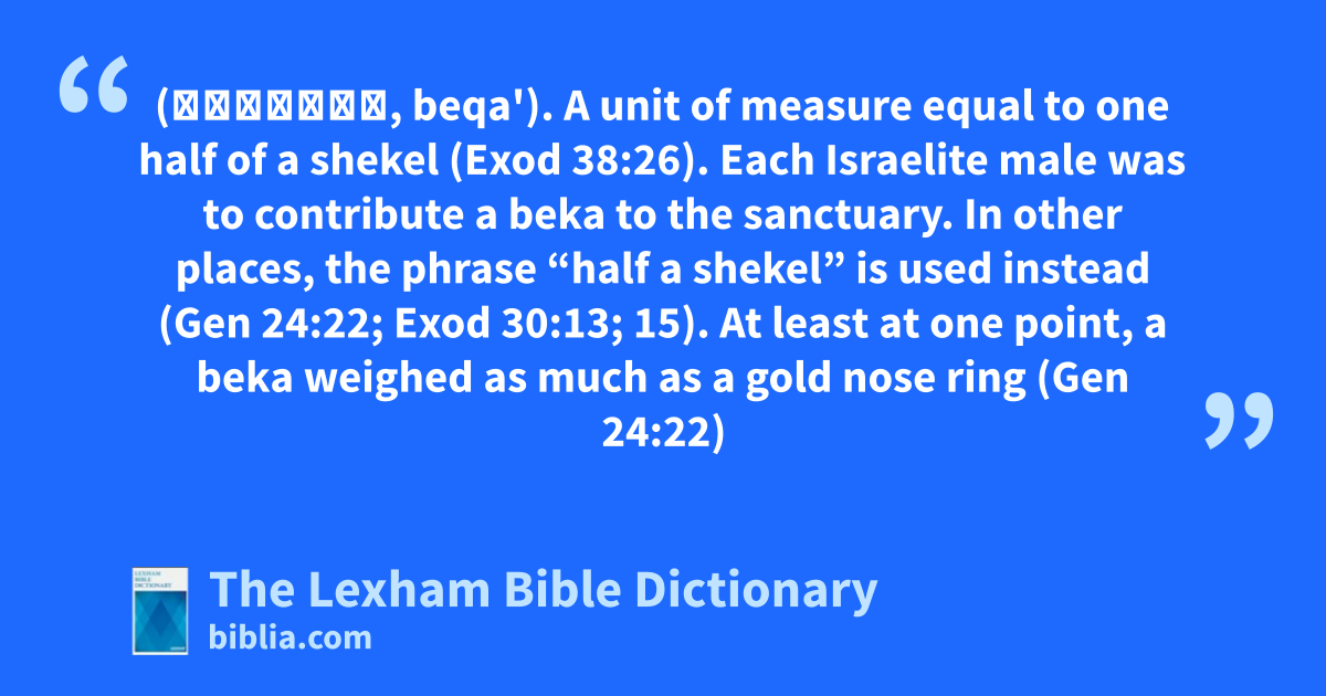 Beka (בֶּ֚קַע, beqa'). A unit of measure equal to one half of a shekel (Exod 38:26). Each Israelite male was to contribute a beka to the sanctuary. In other places, the phrase “half a shekel” is used instead (Gen 24:22; Exod 30:13; 15). At least at one point, a beka weighed as much as a gold nose ring (Gen 24:22)