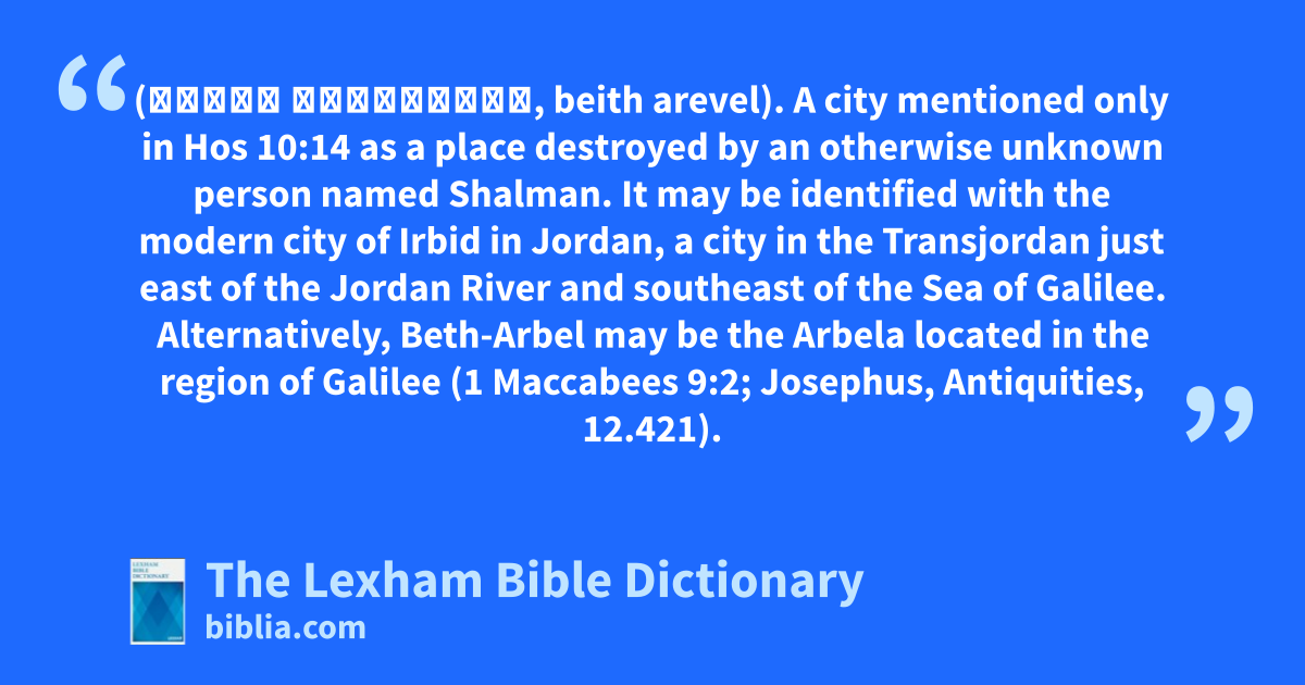 Beth-Arbel (בֵּית אַֽרְבֵאל, beith arevel). A city mentioned only in Hos 10:14 as a place destroyed by an otherwise unknown person named Shalman. It may be identified with the modern city of Irbid in Jordan, a city in the Transjordan just east of the Jordan River and southeast of the Sea of Galilee. Alternatively, Beth-Arbel may be the Arbela located in the region of Galilee (1 Maccabees 9:2; Josephus, Antiquities, 12.421).