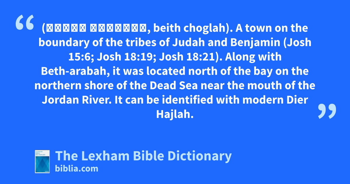 Beth-Hoglah (בֵּית חָגְלָה, beith choglah). A town on the boundary of the tribes of Judah and Benjamin (Josh 15:6; Josh 18:19; Josh 18:21). Along with Beth-arabah, it was located north of the bay on the northern shore of the Dead Sea near the mouth of the Jordan River. It can be identified with modern Dier Hajlah.