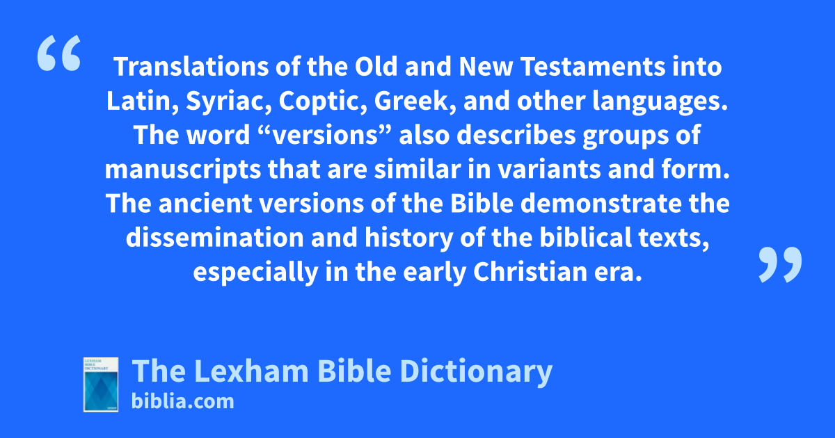 Bible, Ancient Versions of The Translations of the Old and New Testaments into Latin, Syriac, Coptic, Greek, and other languages. The word “versions” also describes groups of manuscripts that are similar in variants and form. The ancient versions of the Bible demonstrate the dissemination and history of the biblical texts, especially in the early Christian era.