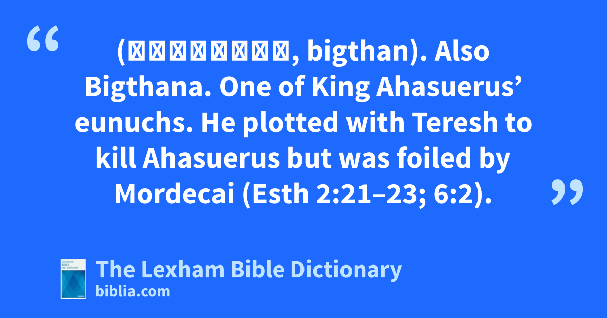 Bigthan (בִּגְתָן, bigthan). Also Bigthana. One of King Ahasuerus’ eunuchs. He plotted with Teresh to kill Ahasuerus but was foiled by Mordecai (Esth 2:21–23; 6:2).