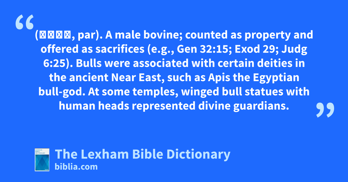Bull (פַּר, par). A male bovine; counted as property and offered as sacrifices (e.g., Gen 32:15; Exod 29; Judg 6:25). Bulls were associated with certain deities in the ancient Near East, such as Apis the Egyptian bull-god. At some temples, winged bull statues with human heads represented divine guardians.