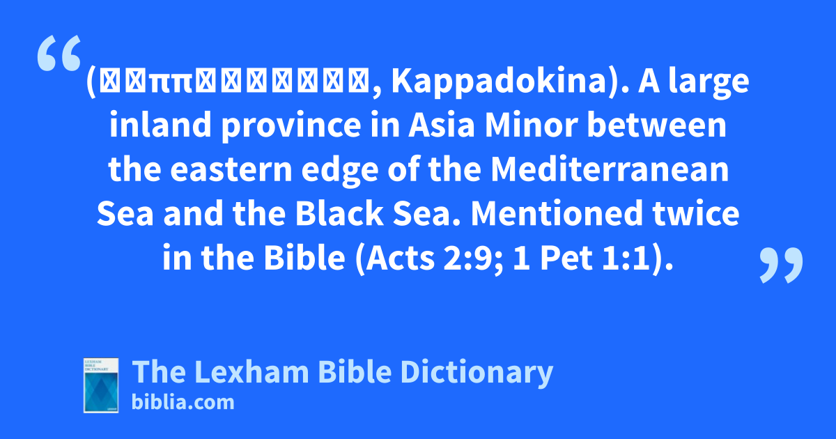Cappadocia (Καππαδοκινα, Kappadokina). A large inland province in Asia Minor between the eastern edge of the Mediterranean Sea and the Black Sea. Mentioned twice in the Bible (Acts 2:9; 1 Pet 1:1).