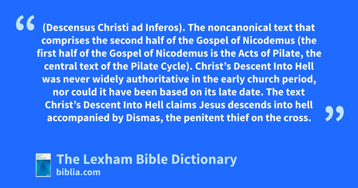 Christ’s Descent into Hell, Text (Descensus Christi ad Inferos). The noncanonical text that comprises the second half of the Gospel of Nicodemus (the first half of the Gospel of Nicodemus is the Acts of Pilate, the central text of the Pilate Cycle). Christ’s Descent Into Hell was never widely authoritative in the early church period, nor could it have been based on its late date.