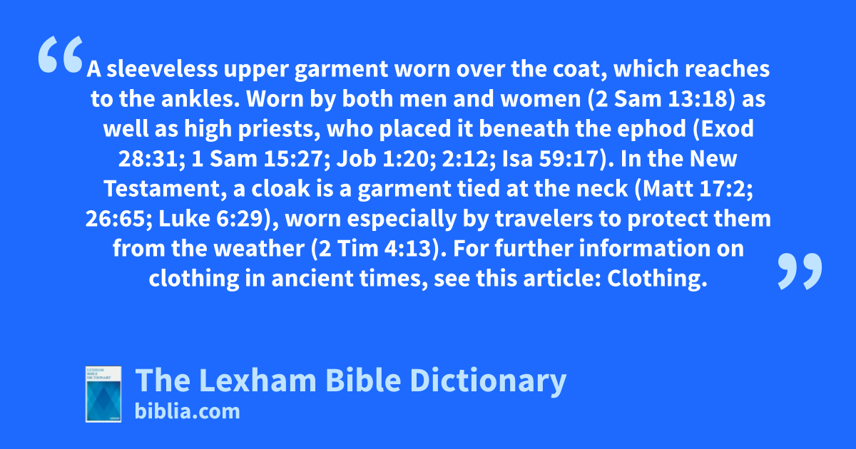 Cloak A sleeveless upper garment worn over the coat, which reaches to the ankles. Worn by both men and women (2 Sam 13:18) as well as high priests, who placed it beneath the ephod (Exod 28:31; 1 Sam 15:27; Job 1:20; 2:12; Isa 59:17). In the New Testament, a cloak is a garment tied at the neck (Matt 17:2; 26:65; Luke 6:29), worn especially by travelers to protect them from the weather (2 Tim 4:13). For further information on clothing in ancient times, see this article: Clothing.