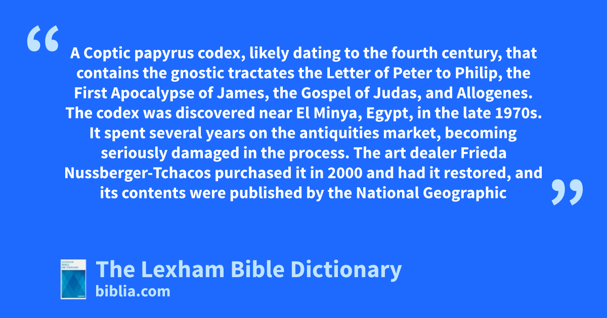 Codex Tchacos A Coptic papyrus codex, likely dating to the fourth century, that contains the gnostic tractates the Letter of Peter to Philip, the First Apocalypse of James, the Gospel of Judas, and Allogenes.