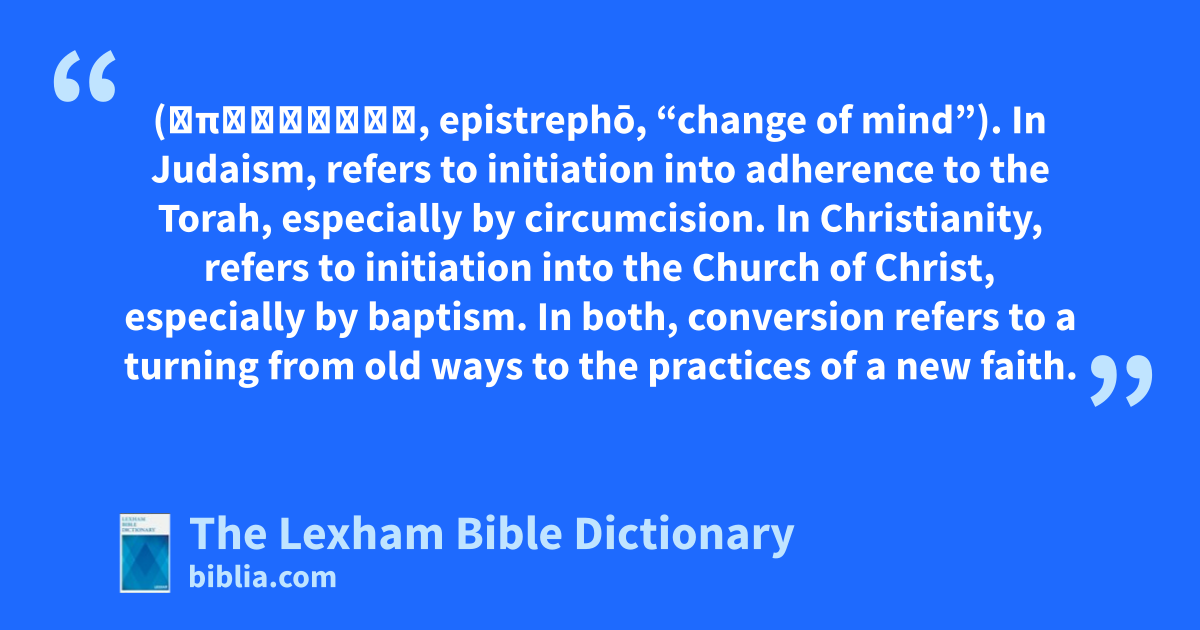 Conversion (ἐπιστρέφω, epistrephō, “change of mind”). In Judaism, refers to initiation into adherence to the Torah, especially by circumcision. In Christianity, refers to initiation into the Church of Christ, especially by baptism. In both, conversion refers to a turning from old ways to the practices of a new faith.